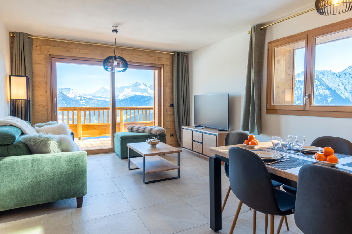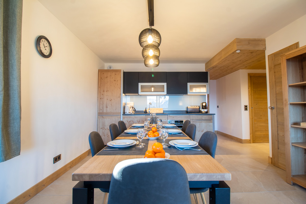 Le salon est idéal pour se détendre en fin de journée, tandis que l’espace repas accueille facilement toute la famille pour des dîners après-ski.